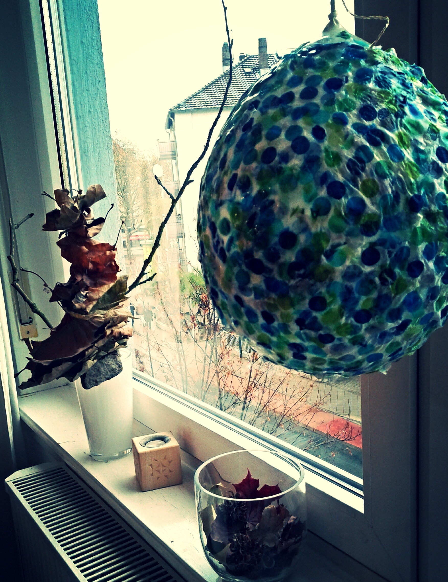 Aber der Vormittag war schrecklich schön. Diese chaotisch beklebte Laterne, der Duft der Pfannkuchen, das leise Regenprasseln, das Lachen der beiden Jungs. Ich mag den Herbst. Bin glücklich.