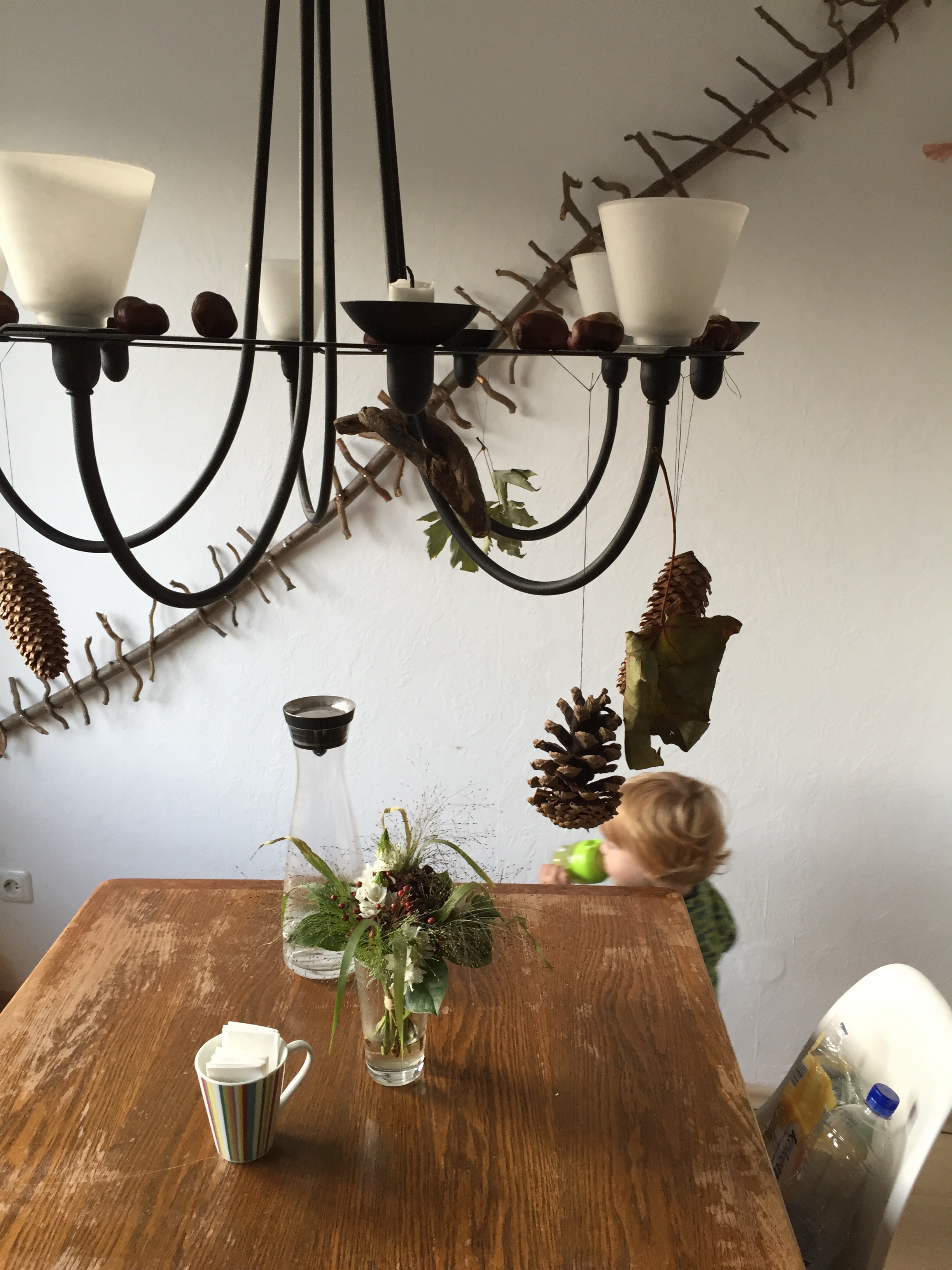 Hier seht ihr eine Kombination aus K2 und Mamaschs Herbstarrangement. Wie sehr gut deutlich wird, bin ich im ästhetischen Kreativbereich eher unterbegabt. Ich kann supergut nachmachen, was ich woanders bereits in schön gesehen habe. Aber eigene Ideen werden nur eher zufällig dekorative Volltreffer. Aber in Zeiten von DIY-Blogs hab ich ja kein Problem mehr, etwas Schönes zum Nachmachen zu finden. Außer bei meinem Leuchter…naja…hängt halt Herbst dran bis die Weihnachtszeit beginnt. 😉