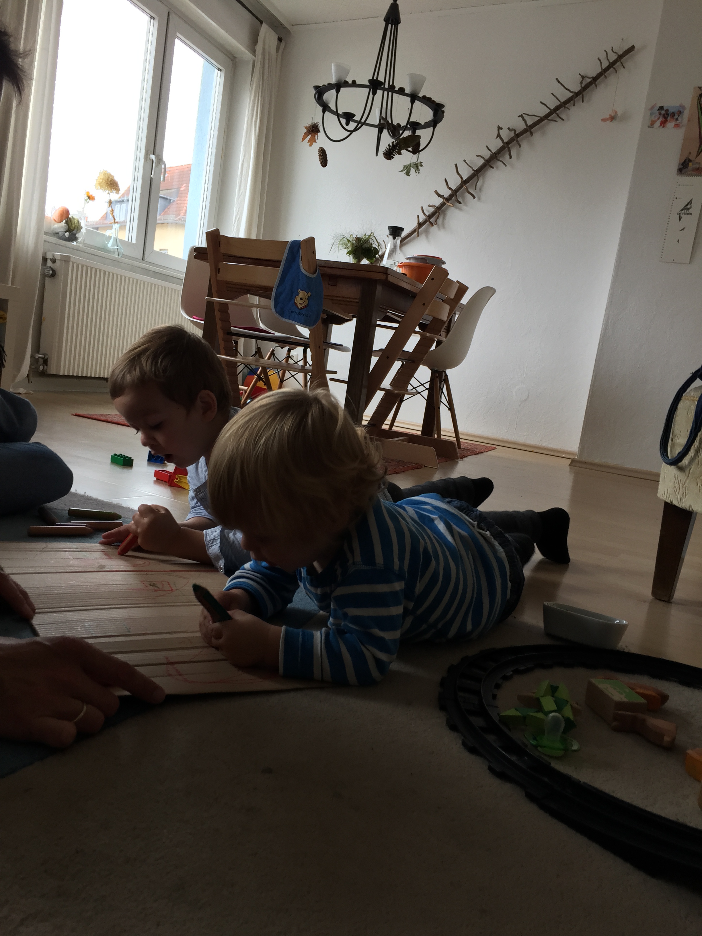 Der Vormittag plätscherte so vor sich hin. Papasch kochte eine Bolognese-Sauce. Die Jungs marodierten durch die Zimmer. Auf diesem Bild wird gerade erkennbar, wie beide Jungs einen Tunnel für die Lego-Duplo-Bahn unter Papas Anleitung verschönern. Ich bin schon in den Startlöchern für den wichtigsten Flohmarkt des Jahres: den Edelflohmarkt in der Centralstation.