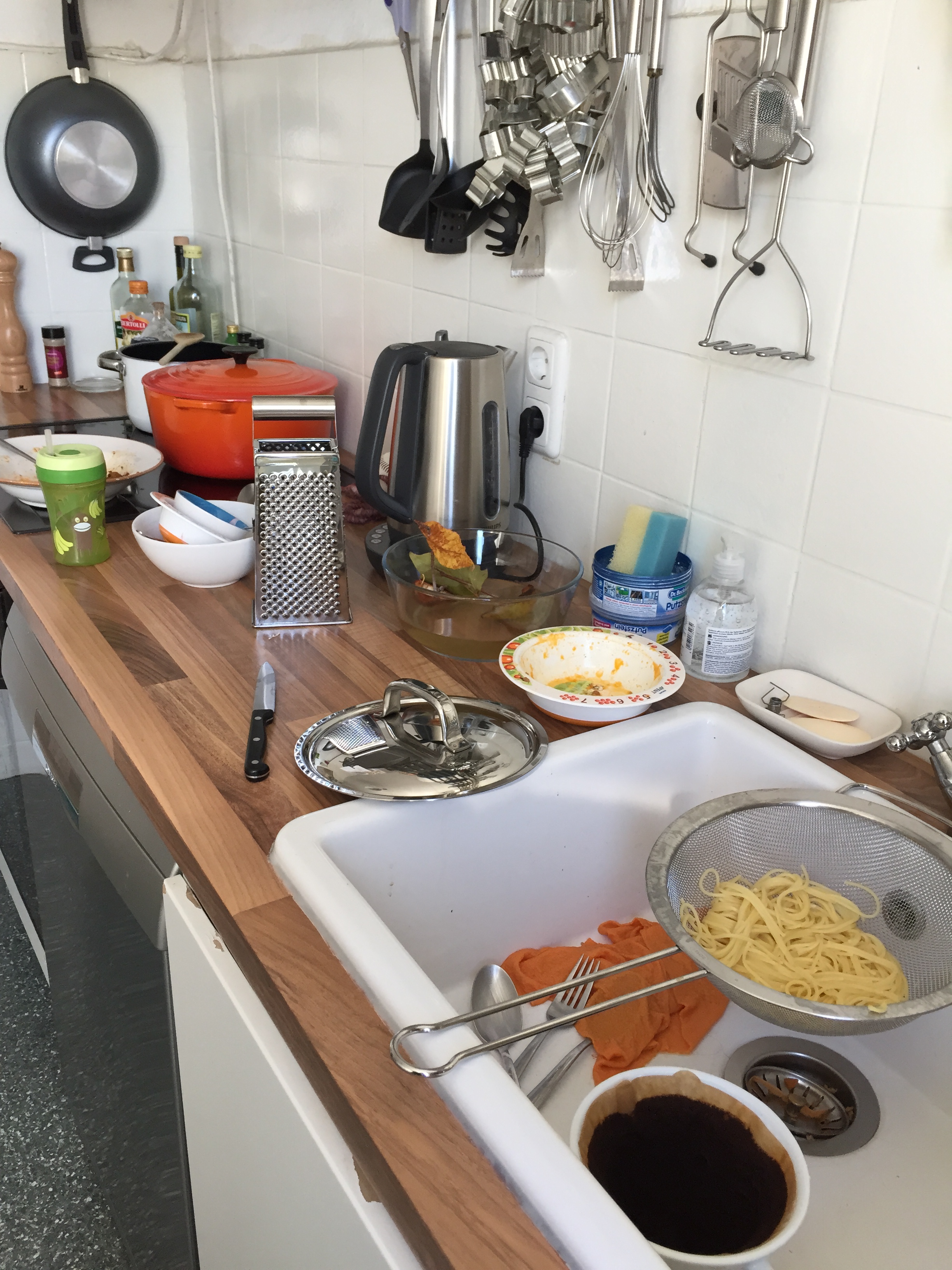 Ein Blick in unsere Küche…ich räum sie so gern auf…und sie ist nie aufgeräumt…da ich von 12 bis 14 Uhr mit dem Flohmarkt beschäftigt war, musste ich mir meine Nudeln nachkochen. Irgendwie ist das Bild ein wenig uninspiriert. Aber ich mag unsere kleine Küche irgendwie gern…^^