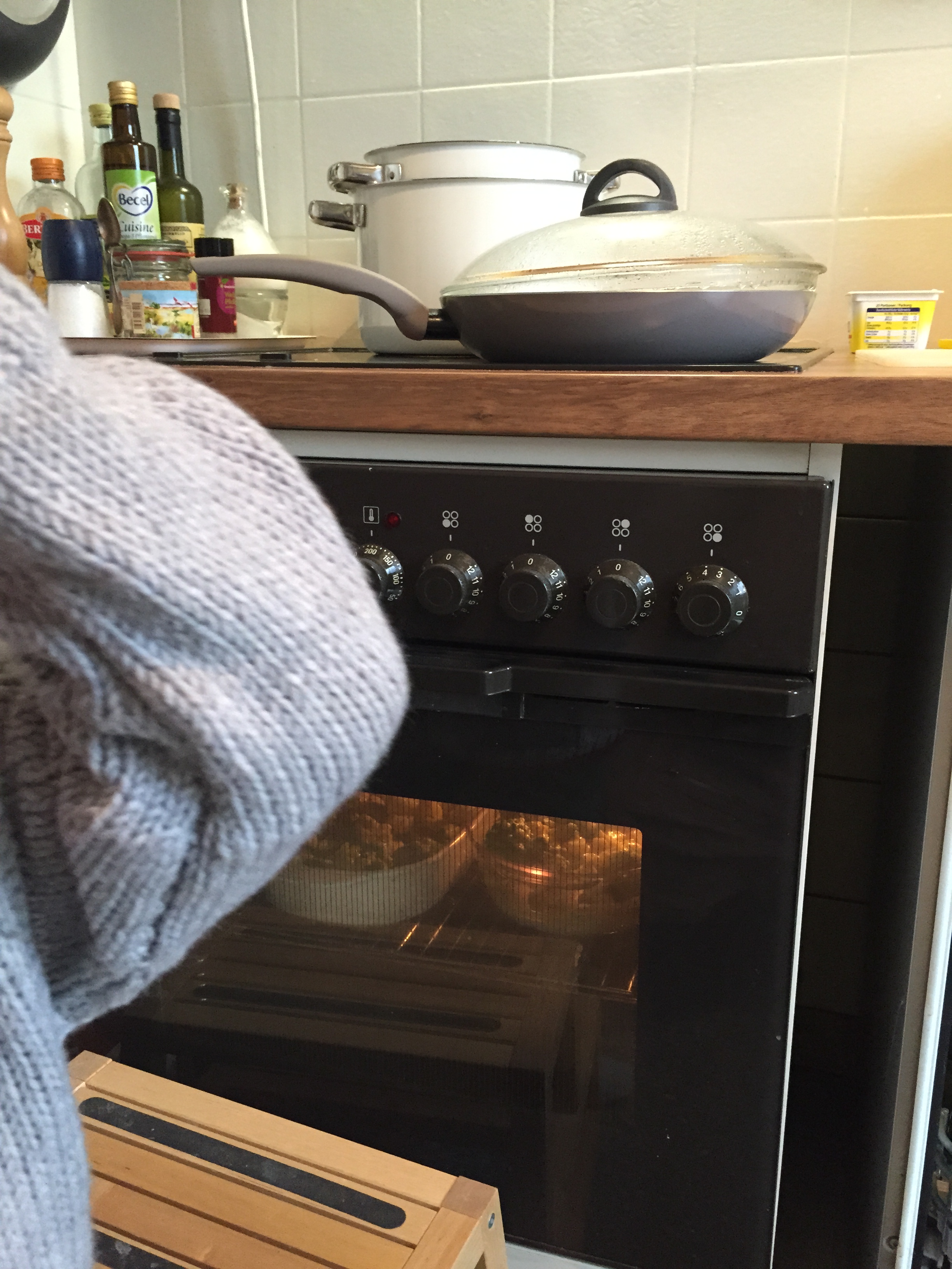 Essen im Ofen. Nach etwa 2h Vorbereitung (ich empfehle definitiv nicht, Kartoffel-Romanesco-Gratin zu machen, wenn man von dem Tag noch was haben will!) stehen die beiden Schüsseln im Ofen. Eine mit Kartoffeln und Romanesco nebeneinander und eine gemischt. Die kleinen Gourmets entscheiden ganz gern selbst, welchen Teil des Essens sie wirklich essen möchten und dem trage ich gerne Rechnung. Schließlich soll Essen ja auch Genuß sein! Klappt auch gut…ich schummel das Gemüse einfach immer an anderen Stellen rein, wo es nicht so deutlich hervorsticht. :))