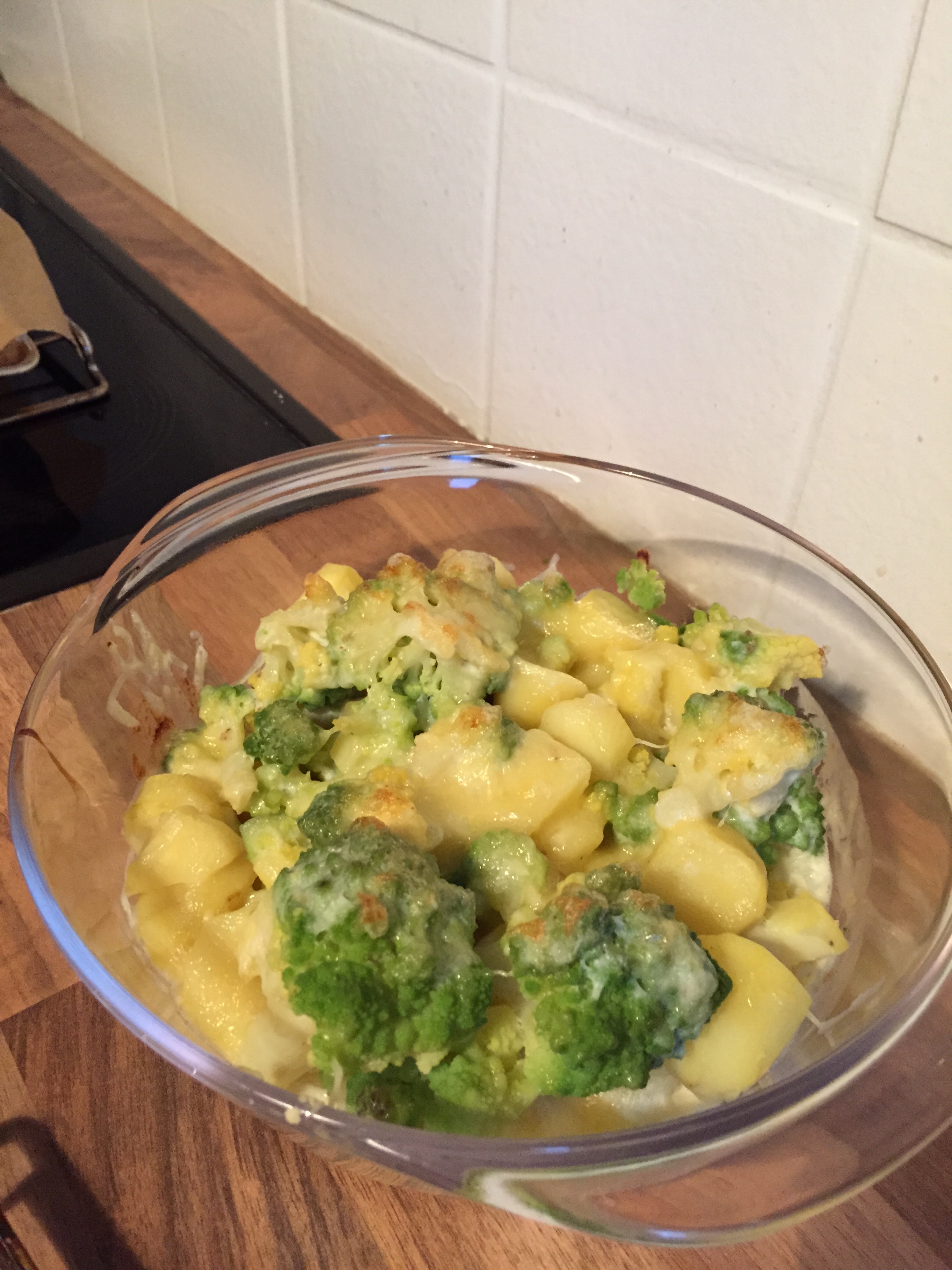 Das nächste Bild zeigt unser Gratiniertes Gemüse-Kartoffel-Gemisch. Meine absolute Leibspeise derzeit. Die Béchamel wird durch eine Zwiebel mit einer Nelke drin, Muskat und einem halben Lorbeerblatt ganz wunderbar fein. Und der Käse, den ich auf dem Mart dazu empfohlen bekommen habe, lässt mein Herz hüpfen. Wunderwunderbar…