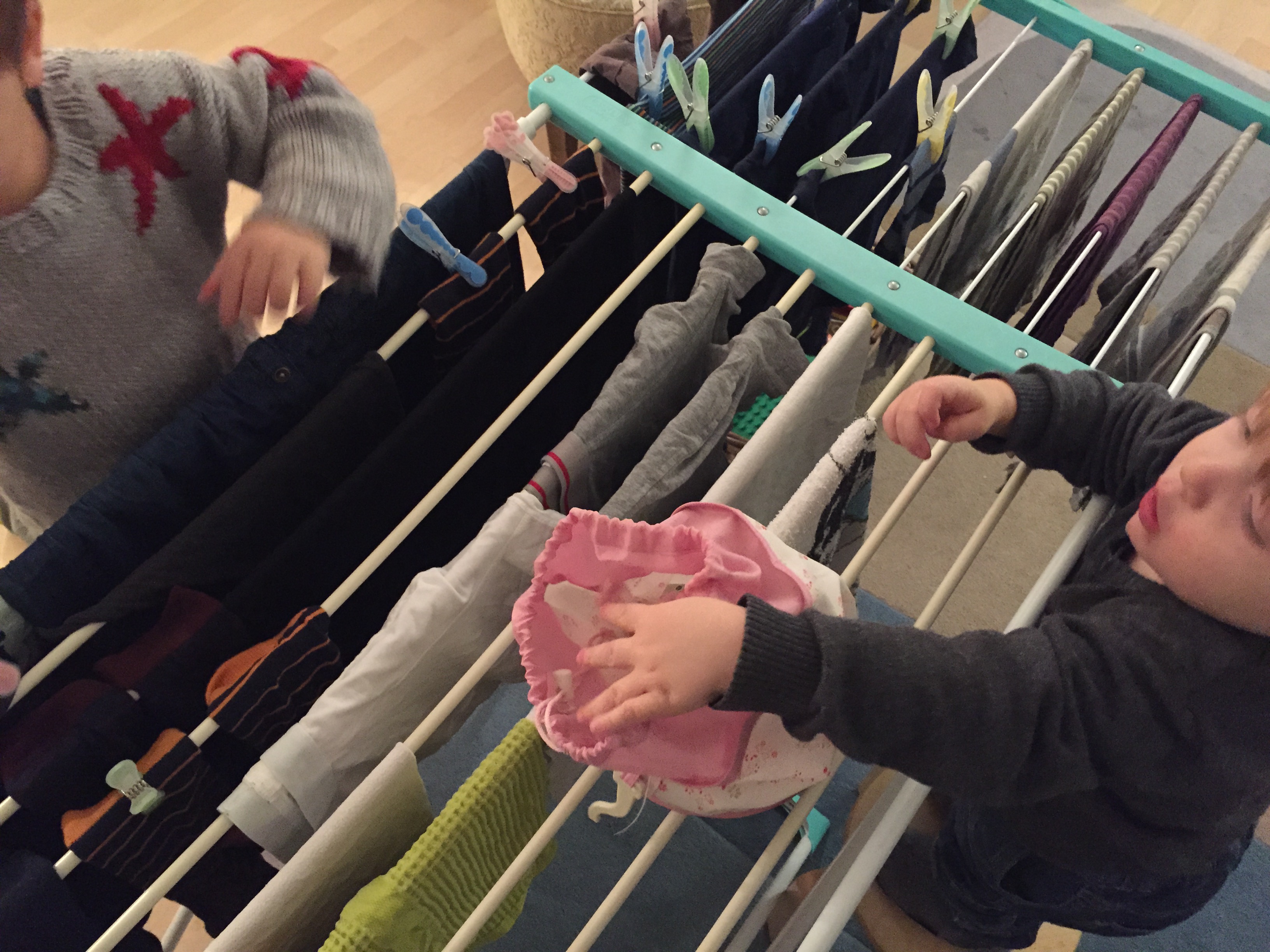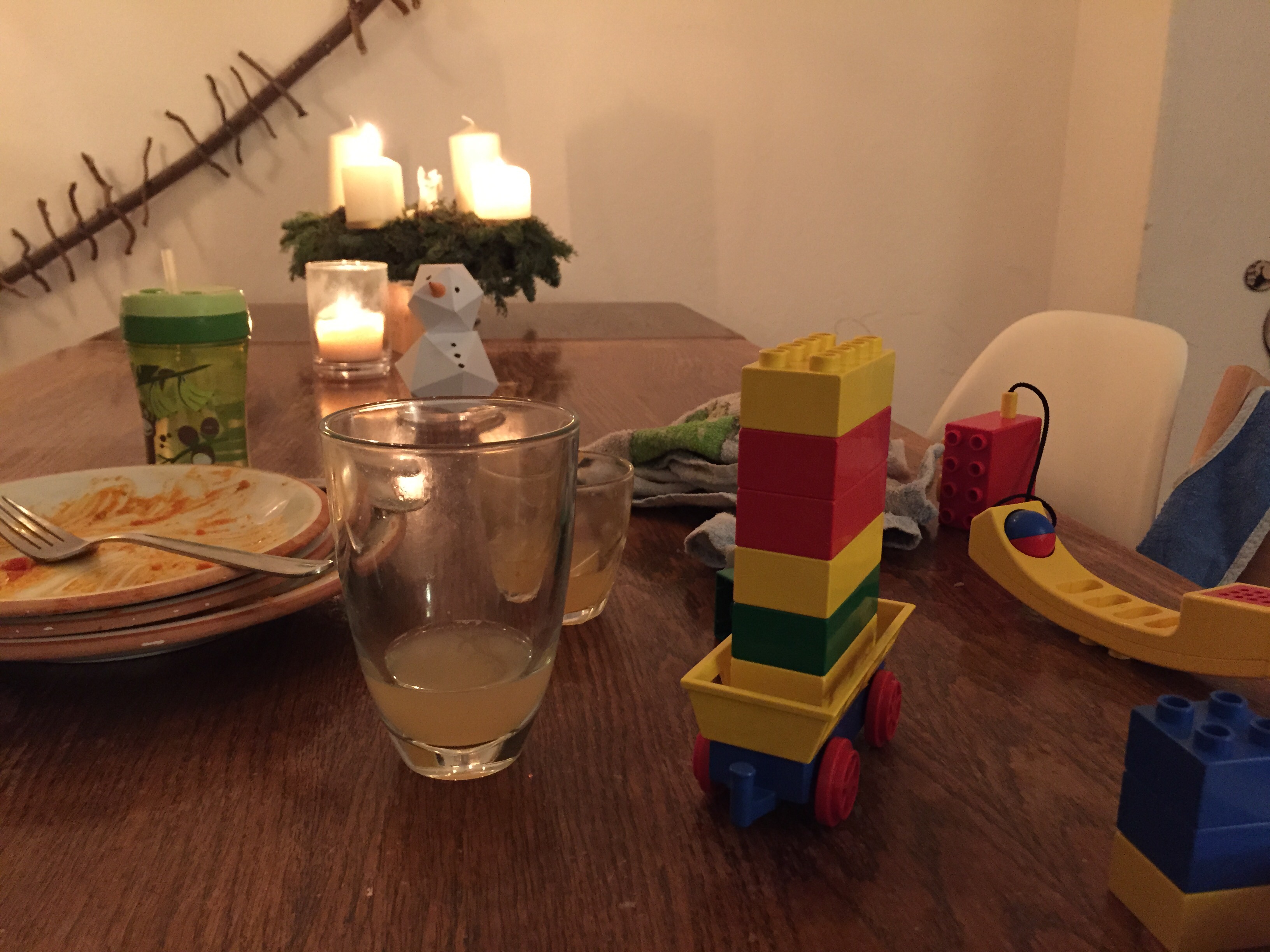 Wir ihr seht, bin ich wieder zuhause. Ich bin einmal durch die Stadt gejoggt um Ersatzadventskranzkerzen zu finden (war nicht ganz einfach) und musste mich arg beeilen, weil Papasch nochmal ins Büro musste, wo er immer noch ist. So gabs ein kurzes Abklatschen an der Tür und ich sah mich von den zwei Jungs umschwirrt wie von zwei Satelliten. Wir haben dann mal die Haushaltstätigkeiten in Angriff genommen. Wäsche abhängen. Beide haben es schon echt gut raus, da nicht nur Chaos zu produzieren sondern ab und an mal der Mama ein erkämpftes Wäschestück direkt in die Hand zu geben, ohne Zwischenstop Fußboden.