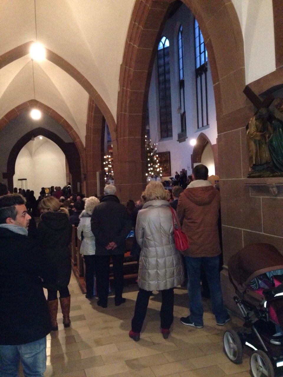 Auf dem Nachmittagsspaziegang mit Papasch sind die Jungs an einer Kirche vorbei gekommen, deren Glocken läuteten. Außerdem strömten da viele Menschen rein. So kamen meine drei Männer zu ihrem ersten katholischen Weihnachtsgottesdienst (glücklicherweise mit Kinderchor und Spielecke).