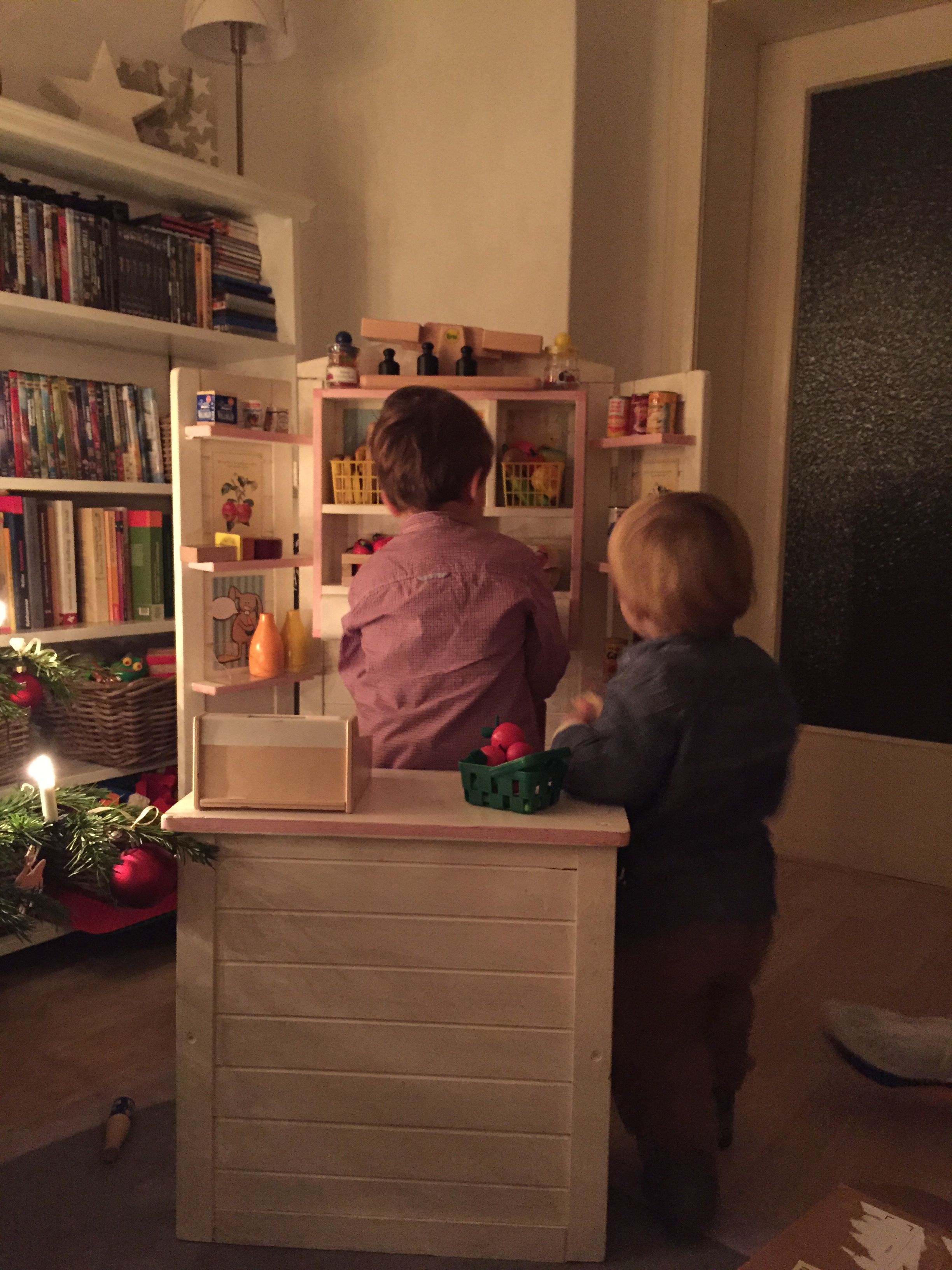 Und das war unser Familienhighlight. Der Kaufladen, den ich im Spätsommer auf dem Flohmarkt gefunden habe. Papasch und ich wurden den Rest des Abends mit Brötchen, Obst, Fischstäbchen und Holzkeksen versorgt…ganz friedlich und voller Begeisterung.