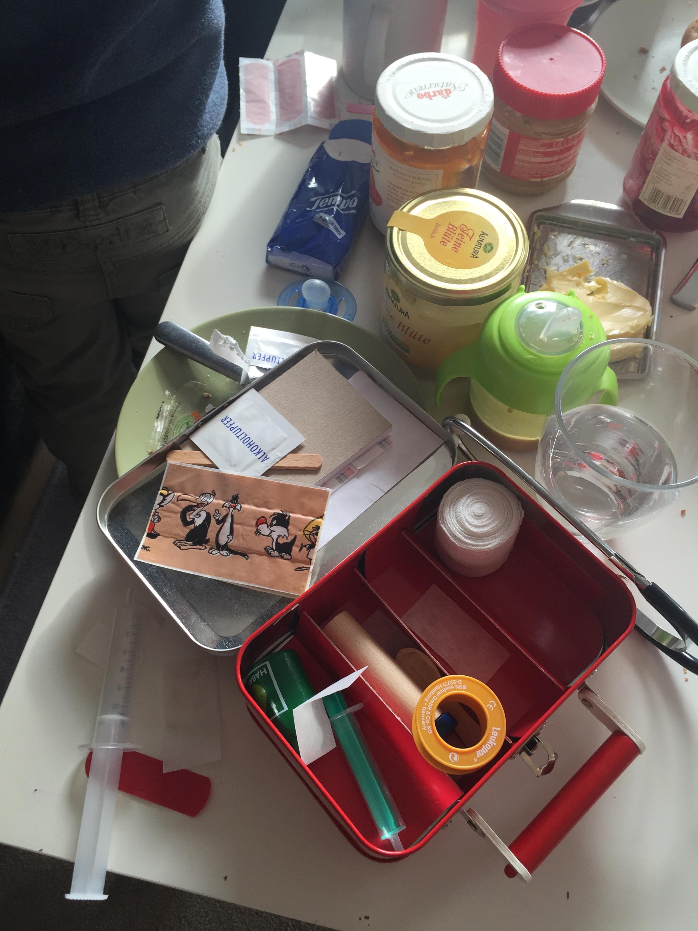 Unser Frühstück ausnahmsweise am Kindertisch. Der Große hatte heute morgen den Tisch aus dem Kinderzimmer des Kleinen geholt und ins Wohnzimmer gestellt. Hab ich eben mal diesen Tisch gedeckt. Das hatte den Vorteil, dass ich das ganze Frühstück über medizinisch betreut wurde. Bin ja krank. Aber etwa 6 Spritzen, 4 Mal Fiebermessen und zwei Pflaster haben geholfen. Hier fliegt auch noch irgendwo ein Rezept rum…