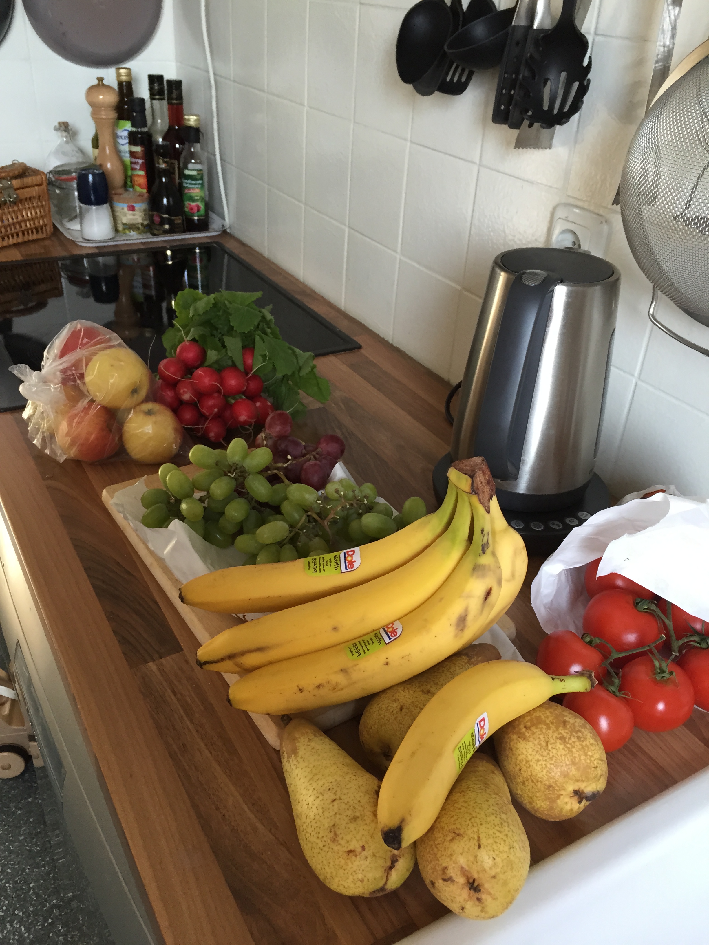 Hier seht ihr die Ausbeute des vorigen Abends. Wir waren für unsere Verhältnisse recht spät in der Stadt unterwegs und konnten so beim Marktschreier zuschlagen! Der ganze Berg Obst und Gemüse um kurz vor 18Uhr für 8 Euro. Ich bin happy…ist nicht unbedingt Bio (können wir uns derzeit nicht leisten) aber alles lecker! Die nächste Woche kann kommen! 😉