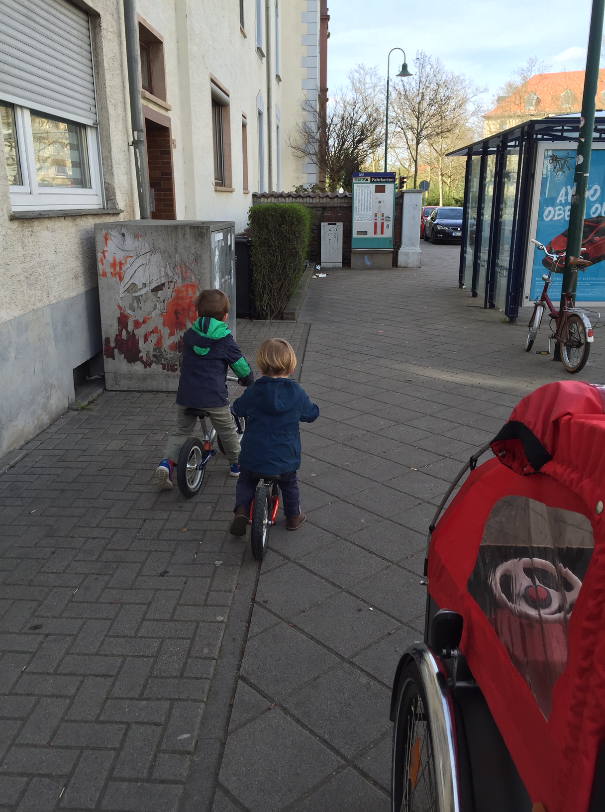 Und weil der Zuckerschock der Waffeln dazu führte, dass beide Jungs nur noch schreiend durch die Wohnung liefen, erbarmte ich mich ihrer, packte das Lastenrad voll mit sämtlichem Equipment und fuhr „kurz“ mit den Jungs in den Park nebenan…ganz kurz…also, auf dem Spielplatz da war ne Freundin mit Kindern…