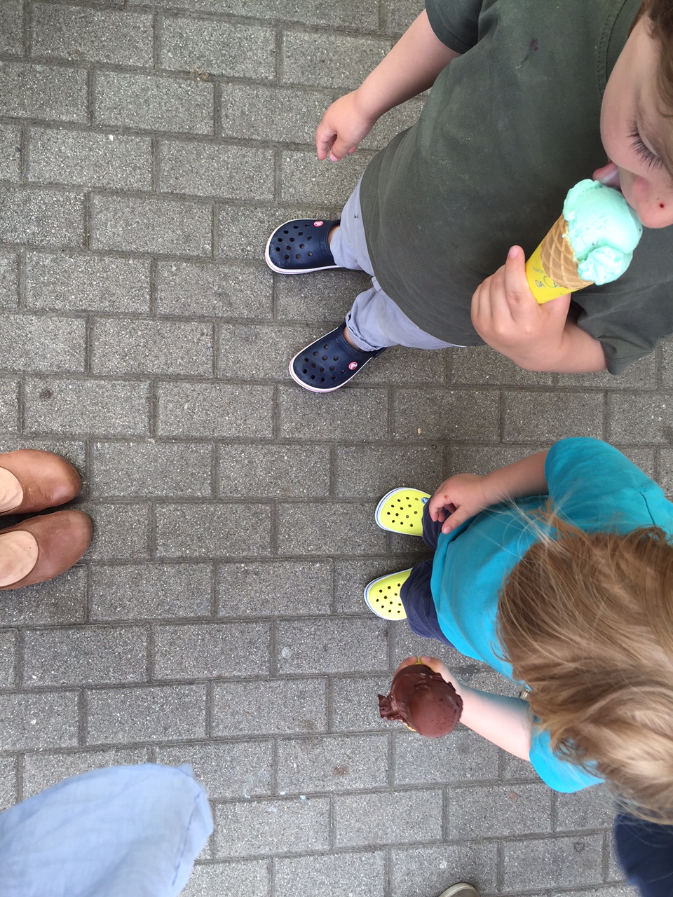 Nach der Arbeit hab ich die Jungs abgeholt. Papasch hat Dienstags einen langen Tag im Büro. Wir waren eigentlich mit der Bewundererin vom Großen verabredet, aber die kleine Dame ist leider krank geworden. Zum Trost gabs ein Eis (praktischerweise liegt direkt in Sichtweite der Krabbelstube eine Eisdiele. Ich denke, wir Eltern ernähren da eine weitere Familie mit, durch unsere regelmäßigen Investitionen ;-)).