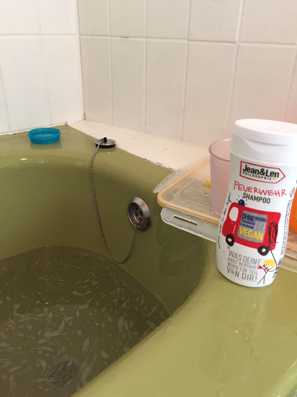 Gerade noch rechtzeitig vor dem Unwetter, das nicht kam, hab ich meine Kinder heimgebracht. Bisher hab ich meistens verflucht, dass unser Badezimmer direkt neben der Wohnungstür liegt und nicht etwa direkt neben dem Schlafzimmer, aber diesmal kam es mir recht. Beide sandigen Kinder in Unterhemd und (voller) Windel kamen oben an und landeten ohne viel Hin und Her in der Wanne!