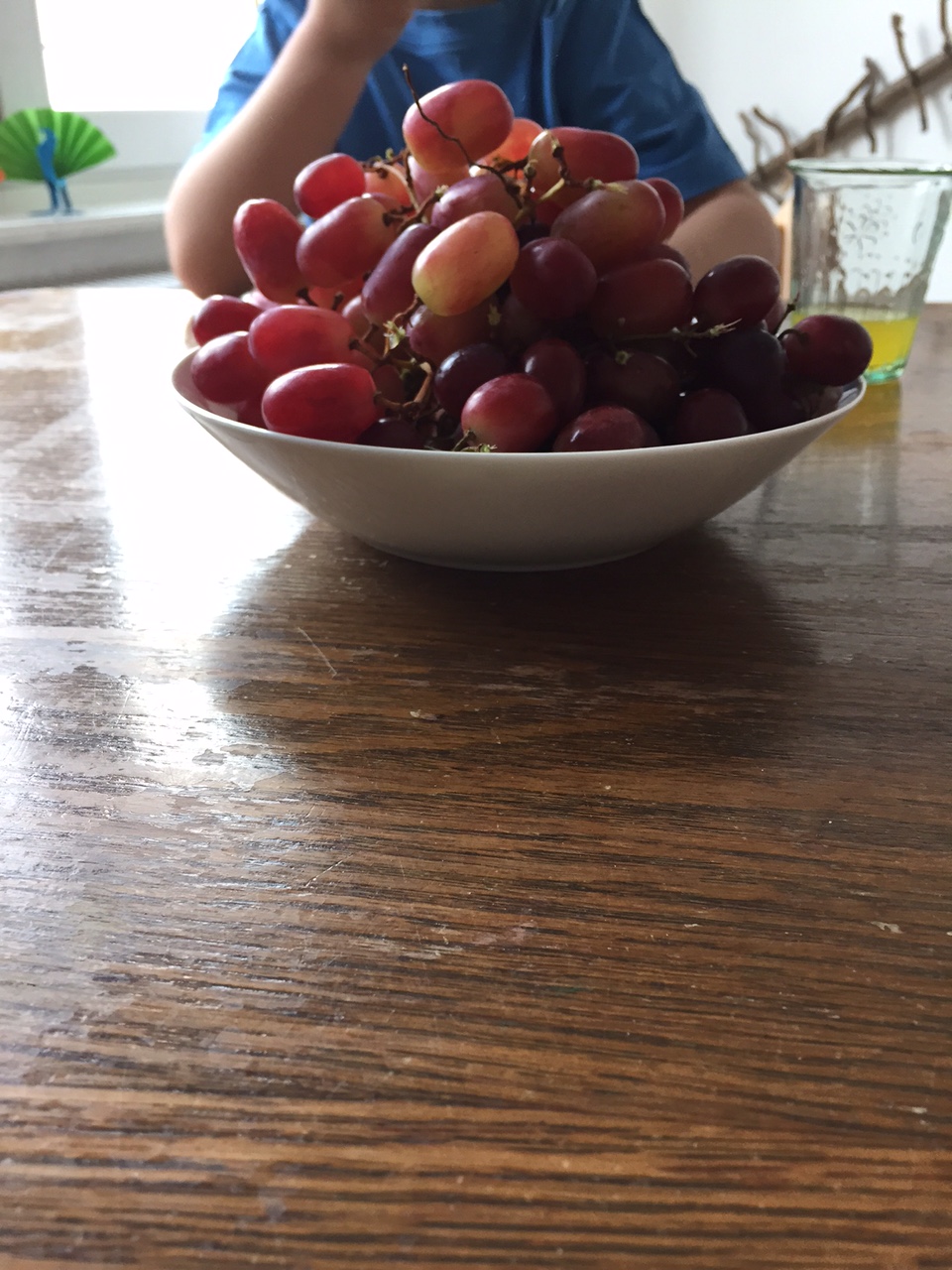 Nach dem Baden einen kleinen Fructose-Schub für die zwei. Nicht zu sehen ist das Pistazienschälchen, das nebenher auch noch platt gemacht wurde. Irgendwie stehen die zwei auf alles, was klein ist und knackt. Wobei: was klein ist und klebt (Rosinen, Gummibärchen…) wird ebenso gern genommen.