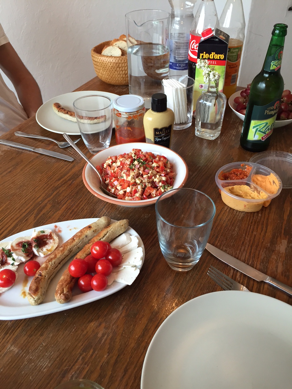 Und so ein Abendessen kommt raus, wenn Mamasch vergisst zu Frühstücken, das Mittagessen verpennt und keine Lust auf Eis hat. 😉 Würstchen, Ziegenkäse mit Rhabarber-Chutney, Paprika-Schafkäse-Salat, die Reste vom Fertig-Hummus, Tomaten, Schafskäse, ein Baguette! Wonne!