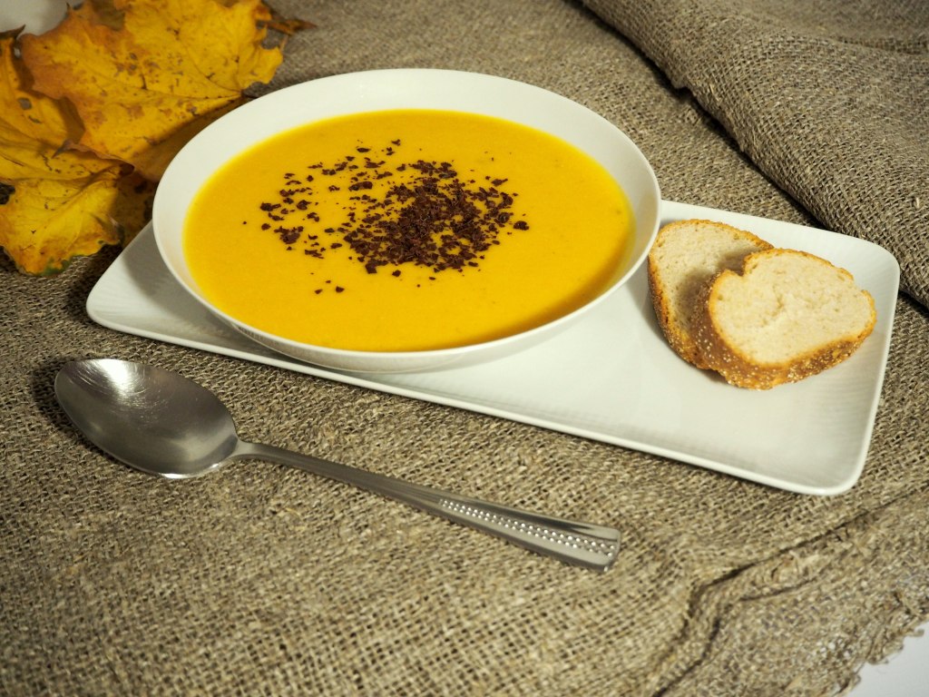 Wenn die wunderschön goldorangene Suppe im Teller steht brösel ich zärtlich die Schokolade darüber und schaue ihr beim schmelzen zu. Ein so schönes Bild…und dann der erste Löffel: ein cremig-zarter Traum aus Herbst, vergangenem Sommer und bevorstehendem Winter.