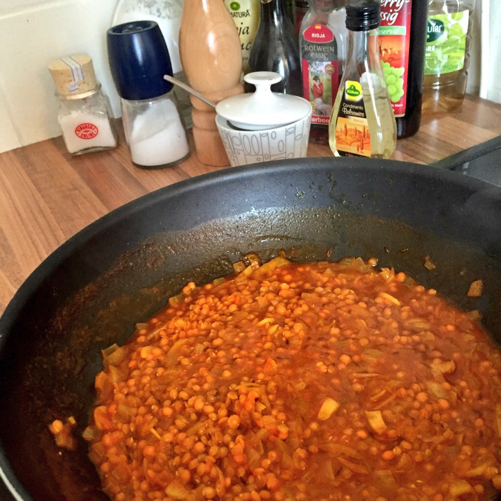Wenn Eure Gewürzzwiebeln schön angebräunt sind, gebt ihr die Linsen, das Tomatenmark und den Ketchup dazu (hier findet ihr mein Ketchup-Rezept, falls ihr schon jetzt zu den Hardlinern unter den HobbyköchInnen gehört ;-))