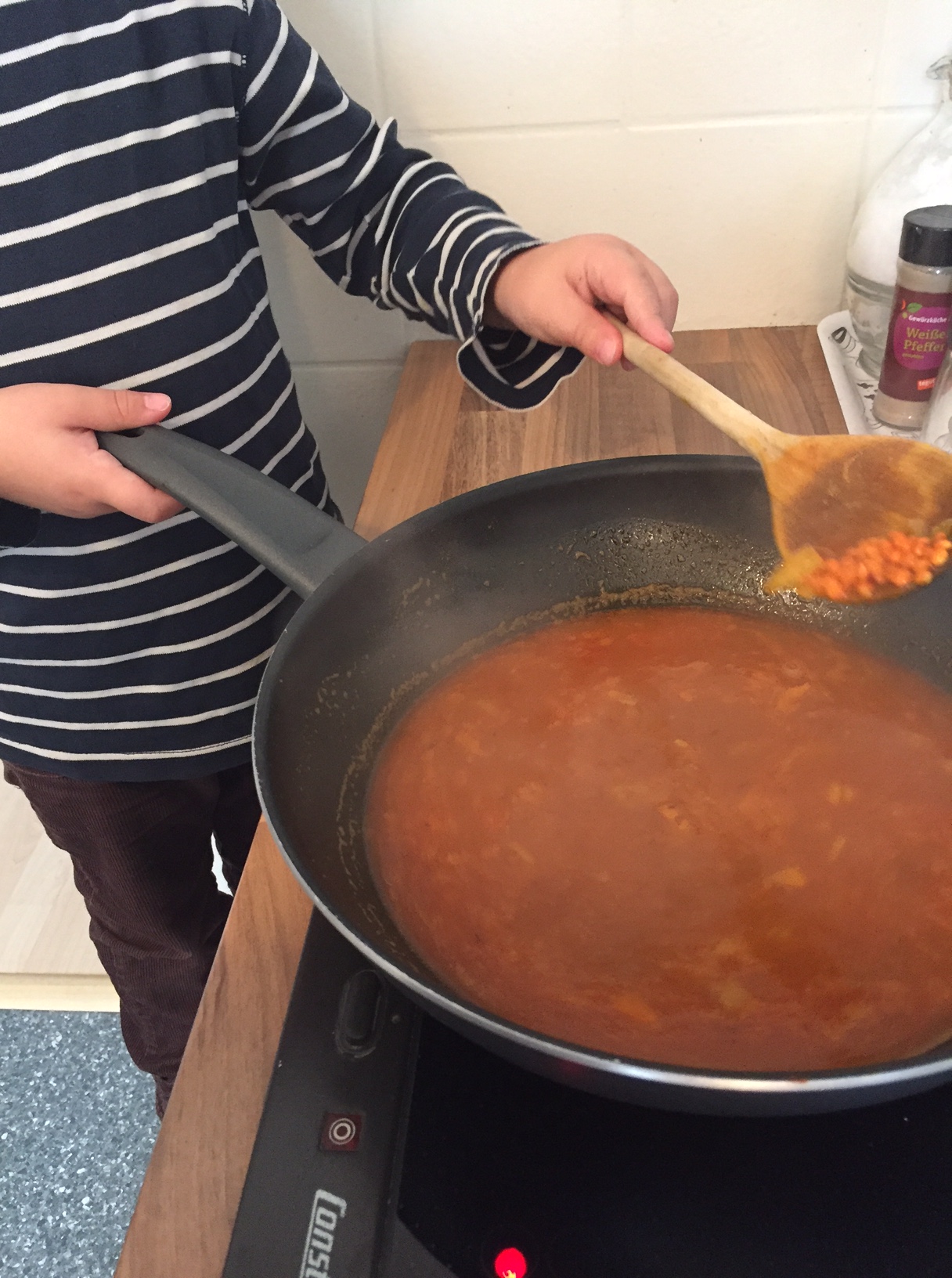 Die Brühe wird auch direkt aufgegossen und zum kochen gebracht…ihr seht meinen Kochkönig bei der Arbeit. Er ist 3,5 Jahre alt und schneidet verlässlich Paprika, Gurke und Tomaten mit dem scharfen Messer. ❤ I'm in awe…