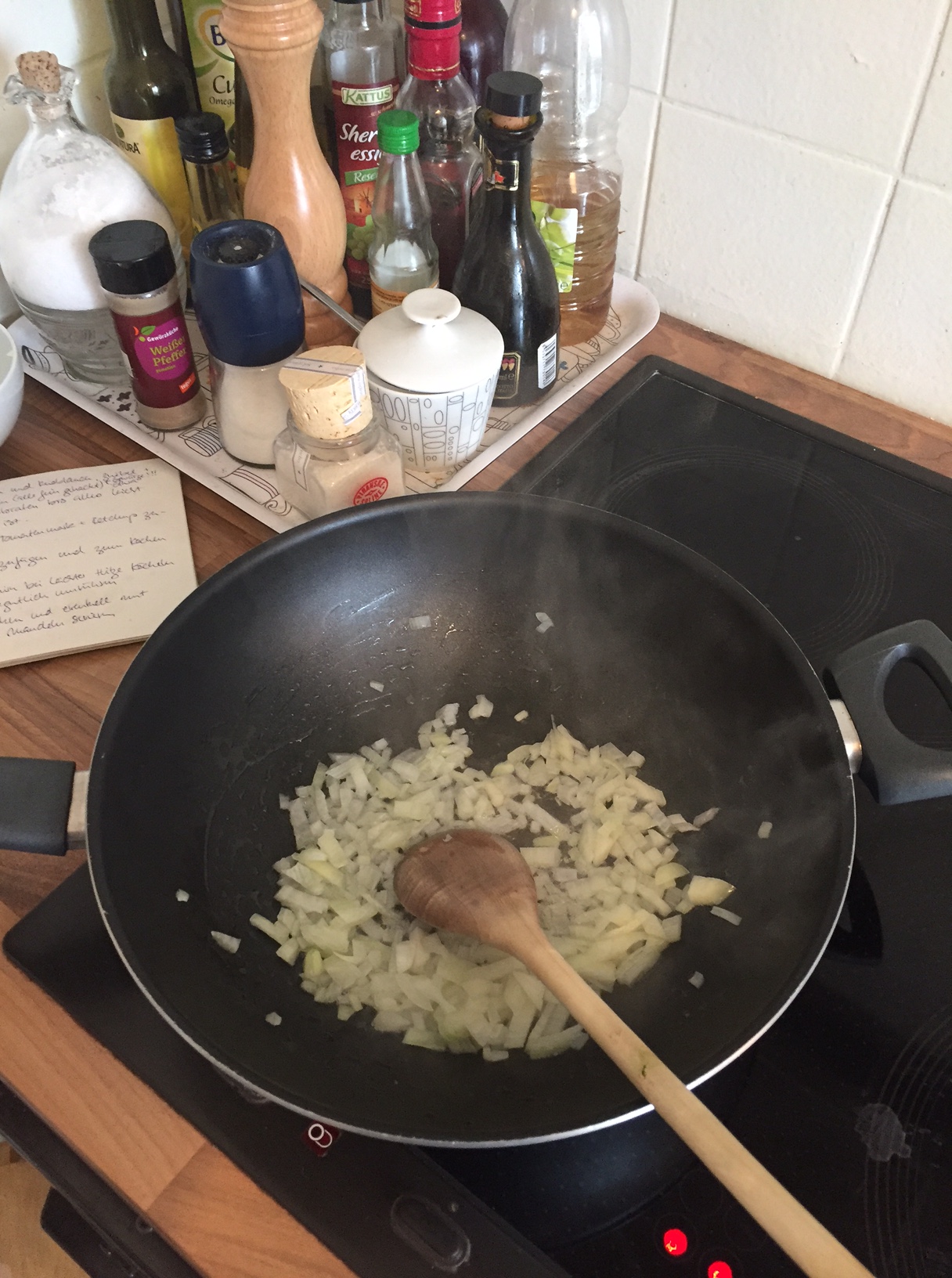 Knoblauch und Zwiebeln werden geschält und fein gehackt (ihr kennt mich, ich hacke nicht zu fein…aber bei dem Gericht achte ich darauf, dass die Stücke nicht größer sind als die Linsen) und in dem Öl angebraten. Dann der schönste Schritt: alle Gewürze dazugeben und den Duft beim unterrühren genießen…es duftet so wunderbar…